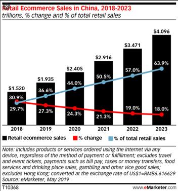在2019年,中国的电商渗透率是36.6%,而美国的电商渗透率仅10.7%。