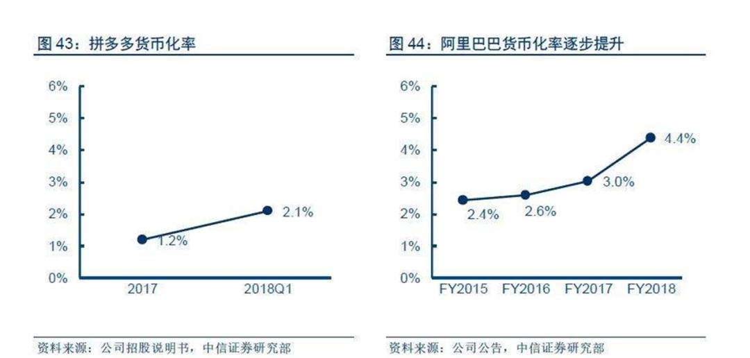 以阿里巴巴为例,平台整体的货币化率从 FY2018 的 3.66 %提升到 FY2019 的 4.32%,FY2020年的货币化率从公开数据来看已经接近5.2%。(阿里巴巴2020财年的数据,490亿美元的电商和服务费营收,对应9300亿美金的GMV,算下来货币化率大概是5.2%。)