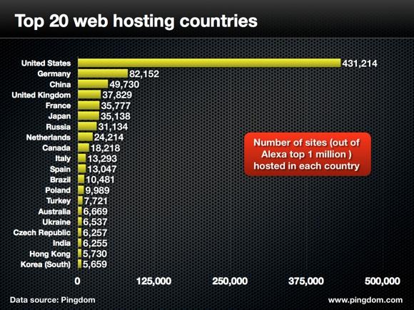 从网站域名的维度去看网站的归属地,美国有近1亿的网站。