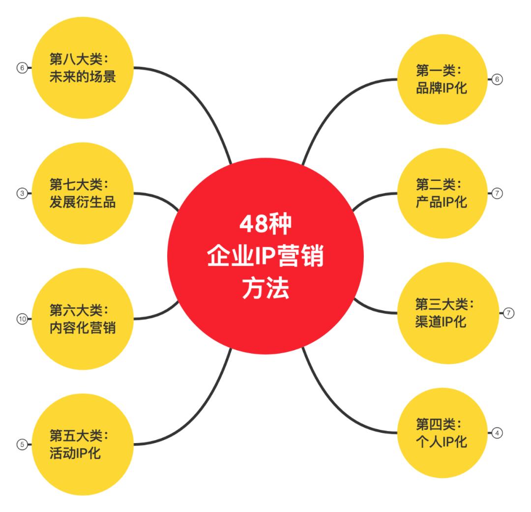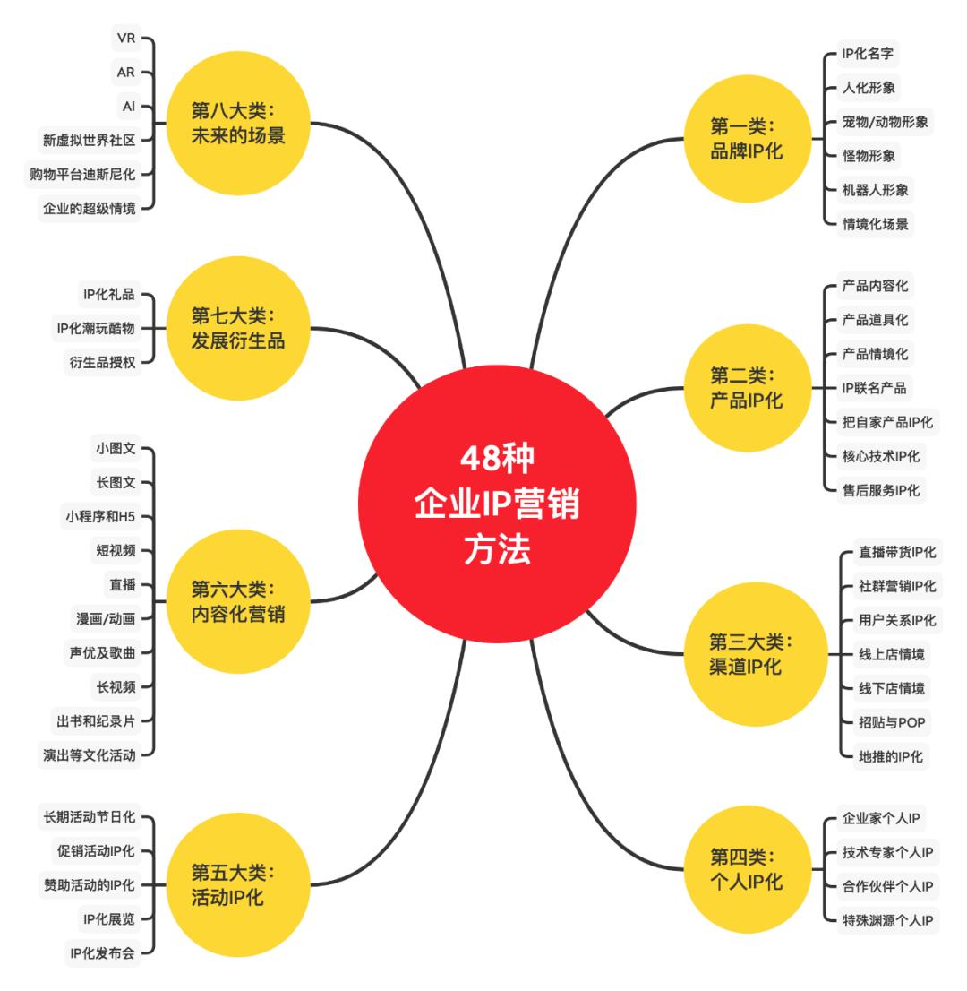 如图所示,共分为八大类型,分别是:品牌IP化6种、产品IP化7种、渠道IP化7种、个人IP化4种、活动IP化5种、内容化营销10种、发展衍生品3种、未来的场景6种,合计48种。
