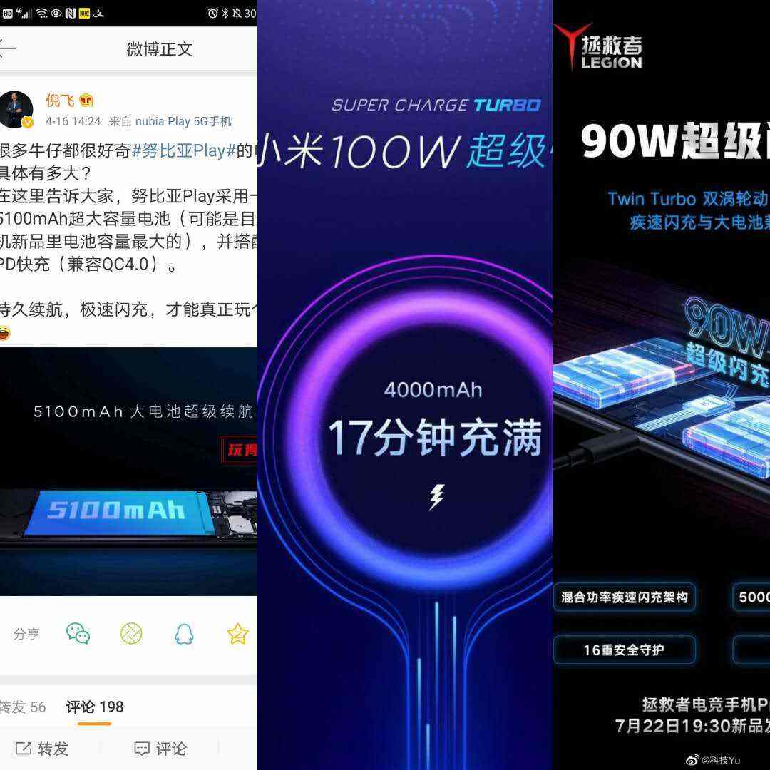 就在一个月以前,各大手机厂商推出的手机中,快充频率基本在40W、65W。目前手机的电池容量一般在4000mAh左右,据各家手机厂商发布的实验室数据,在最新的100W或者125W的功率之下,手机只需要15-20分钟就可以把电充满。