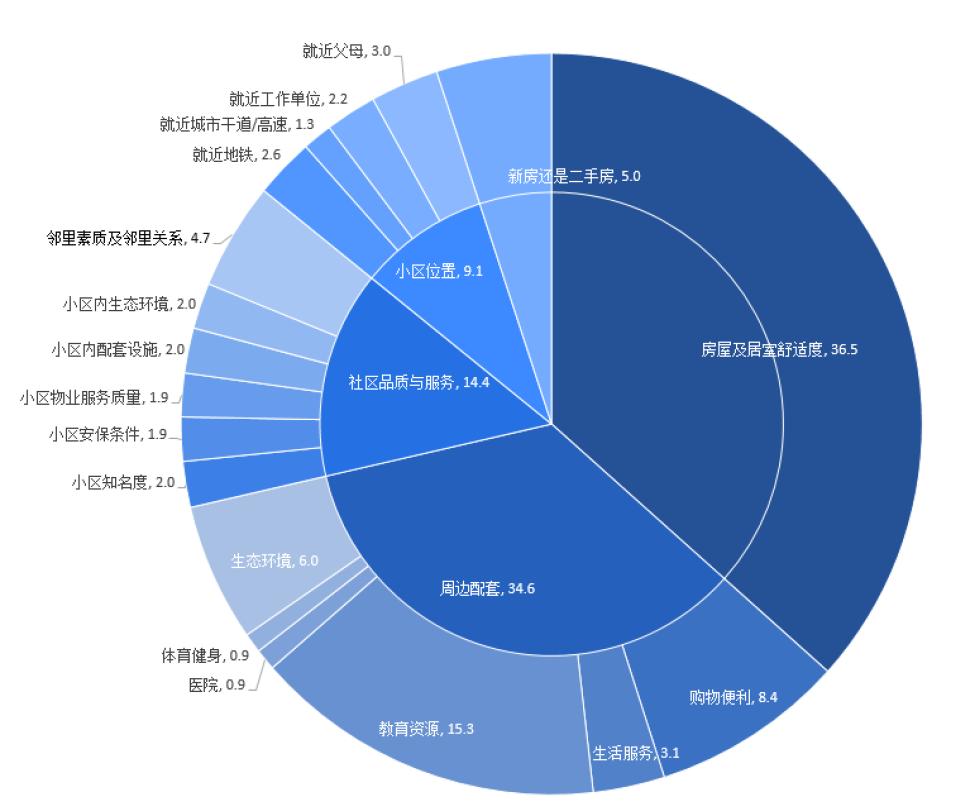 4. 换房客首要考虑房屋及居室舒适度,配套类型中教育资源重要性突出,邻里关系为小区品质的重要体现。