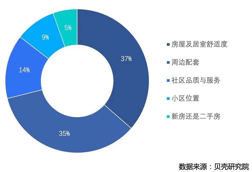 首要考虑房屋及居室舒适度:除预算外,选取房屋舒适度、周边配套、社区品质、小区位置以及新房或二手房房屋属性等五项影响因素,请受访换房客进行重要性比重赋分。结果显示,房屋及房屋舒适度、周边配套重要性分别以37%、35%居于重要性首、二位。社区品质服务、小区位置分别以14%、9%位列第三、四位。至于房屋为新房还是二手房对于换房客而言重要程度不高。