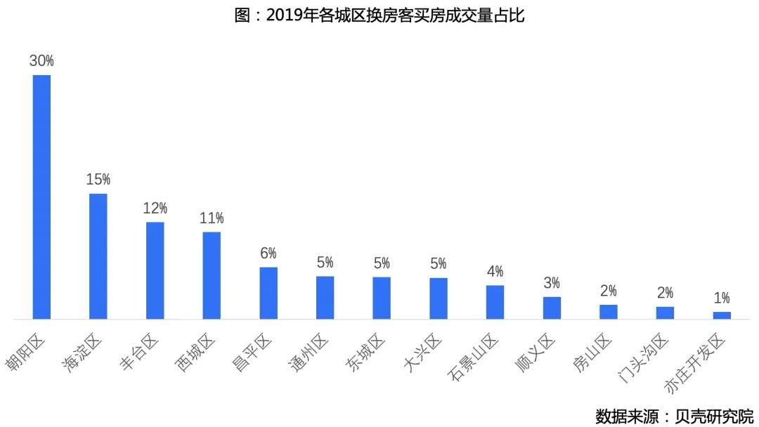 从置换区域来看,换房客的主要流动向区域包括朝阳、海淀、丰台区、西城,成交量占比均在10%以上,朝阳区以30%居于首位。