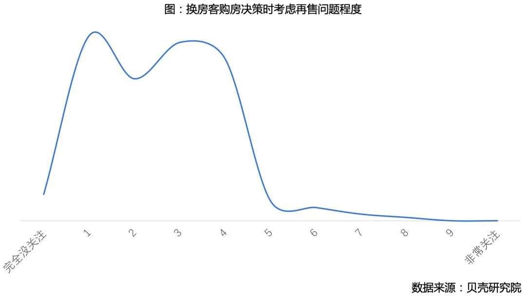 针对购房决策中考虑再售问题程度调查,“0”表示完全没关注、10表示“非常关注”,结果显示,换房客对于是否考虑再售难度的加权平均得分仅为2.6分。“新刚需”报以“首改即终改”的心态进行置换。