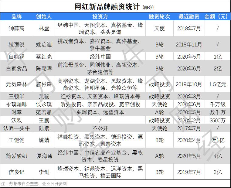 拉面说最近的一笔融资是2018年11月,投资方有真格基金、紫牛基金等;网红饮料元気森林最近的一笔融资,则是2019年10月来自高榕资本、龙湖资本、黑蚁资本。