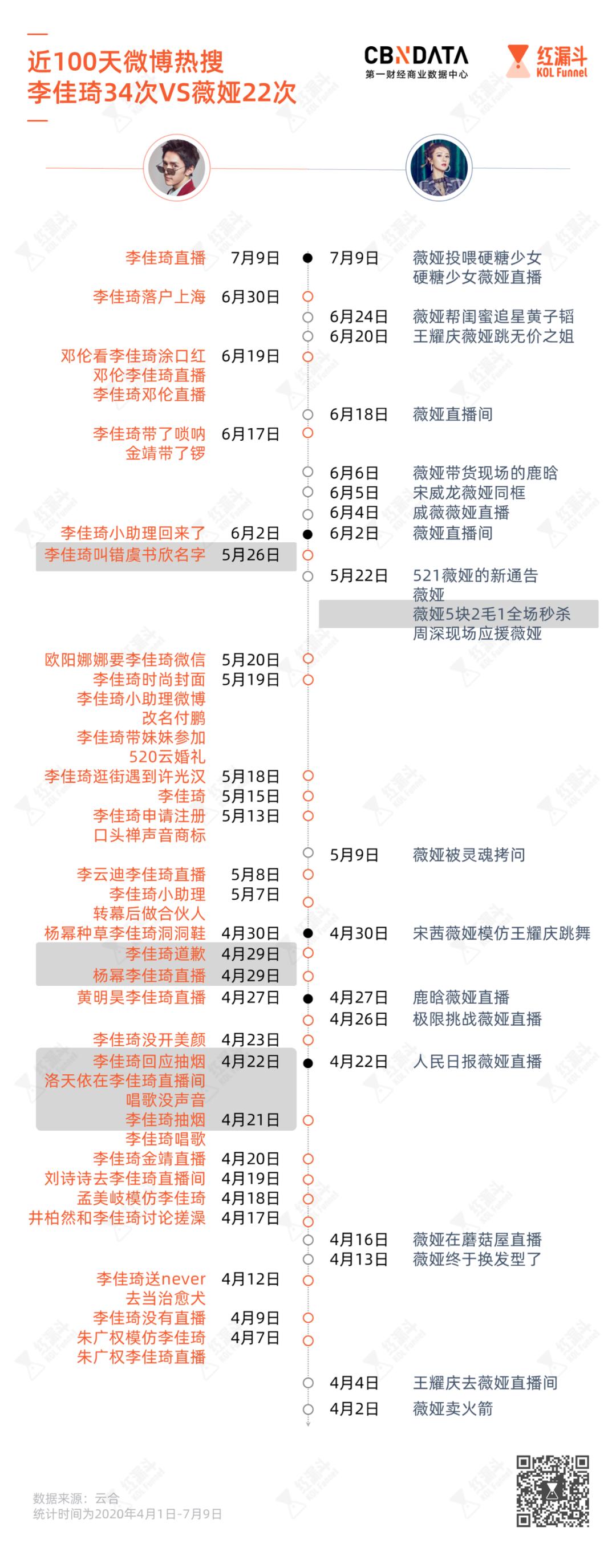 一个有意思的现象是,李佳琦和薇娅很少同时霸占热搜,整个上半年外加7月初,两人只有4次同天登榜,仿佛是有默契的互相承让,你唱罢来我登场。