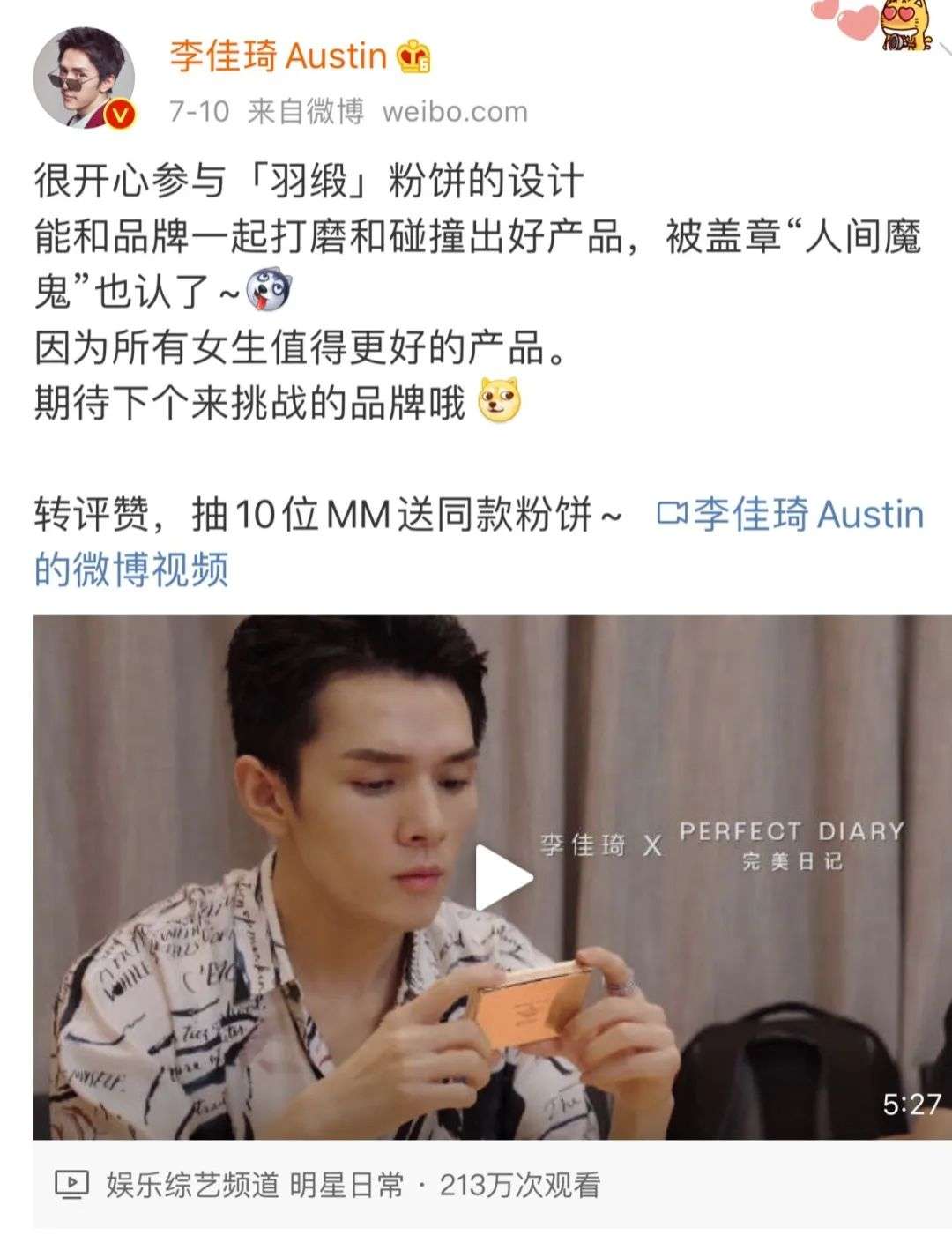 7月10日,李佳琦发布与完美日记合作的视频。“很开心参与「羽缎」粉饼的设计,被盖章‘人间魔鬼’也认了。”这条视频记录了李佳琦参与产品设计的全过程,多次提出修改意见、不停对打样进行测试。