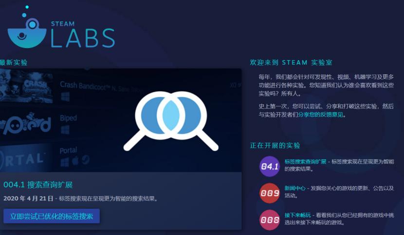 2019年7月,Steam上线了“Steam实验室”模块,并把入口放在了平台首页。该板块作用是针对可发现性、视频、机器学习及更多功能进行各种实验测试。首期上线了“微型宣传片”、“交互式推荐模型”和“自动展示”功能。所有玩家都可以去试用并提交反馈建议,Steam也会据此对它们做出改进。