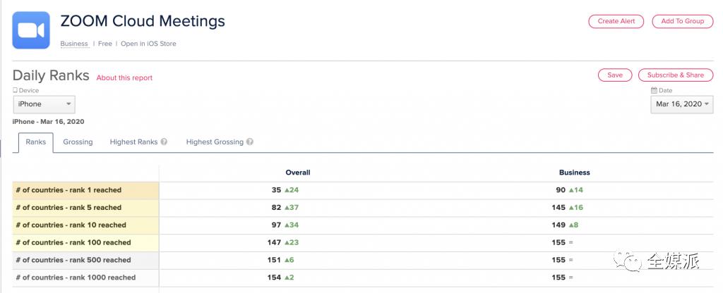 根据App Annie的数据,Zoom在全球范围内都受到欢迎,在诸多国家与地区都登上了热门下载排行榜。2020年3月16日,Zoom从35个国家和地区的iPhone应用程序市场中脱颖而出,下载量名列第一。如果将领域缩小到商务办公类应用,Zoom在90个国家和地区的下载量跃升为top1。