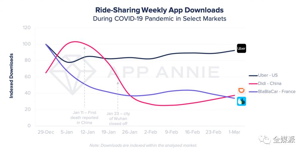 在打车软件市场上,中国与法国受到的影响较为突出。从1月到3月,滴滴打车的数据较峰值相比出现了下滑,法国的BlaBlaCar较峰值相比下降了65%。尽管韩国的Kakao Taxi和日本的Japan Taxi也有一定程度的下降,但其曲线下滑程度并不十分剧烈。而在统计周期内,Uber在英美两国的下载量并未出现显著下降。