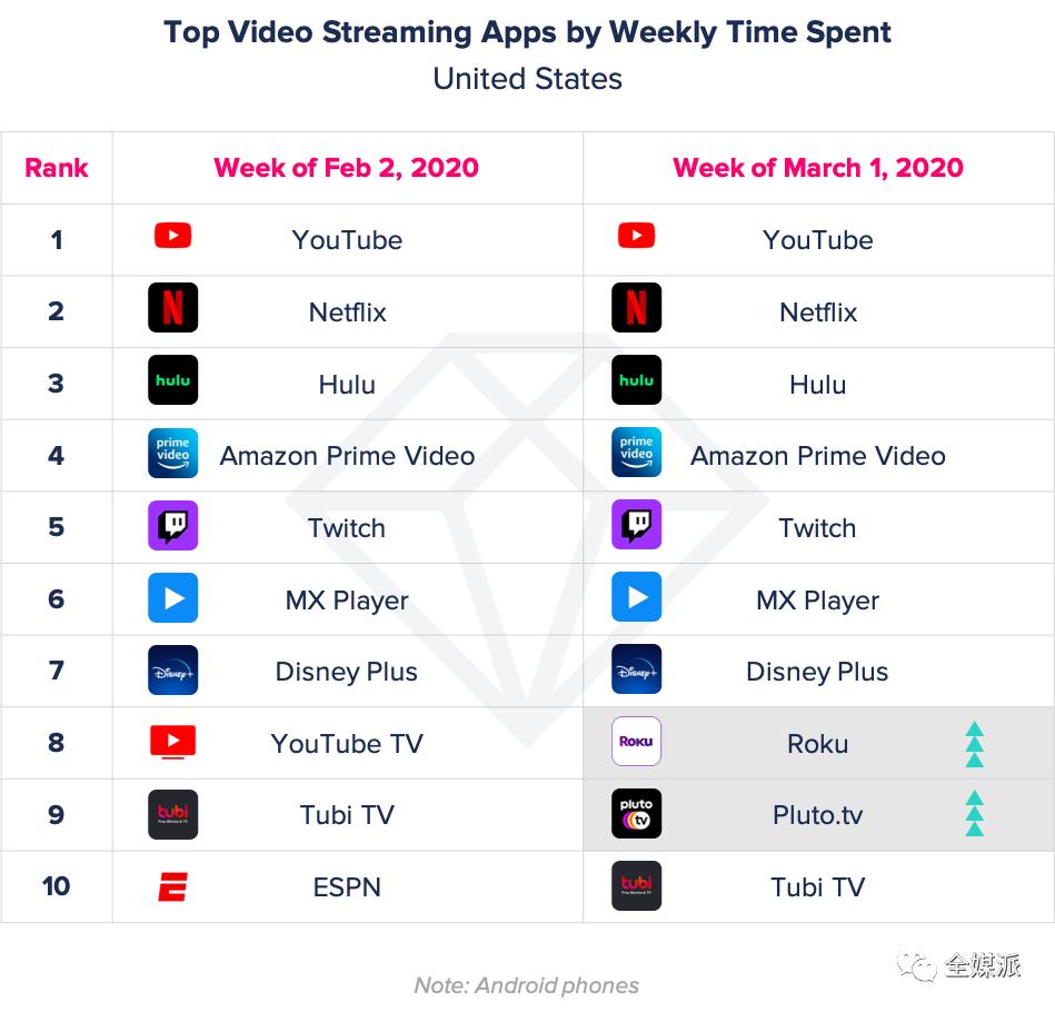 Roku的应用程序既可以让用户在移动设备观看流媒体内容,同时也可以当成Roku播放器的控制器。Pluto TV则是一项完全免费的服务,相较于Netflix、Hulu等一系列需要订阅才能观看的流媒体产品,Pluto TV对于消费者的门槛较低,在3月的第一周,安卓终端中Pluto TV的周均用户使用时长增加了75%,这也是Pluto TV有史以来的最高记录。