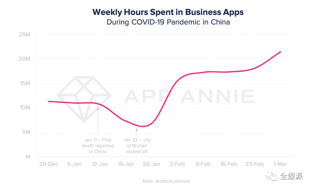 病毒在全球范围内的传播导致其他国家的移动应用市场也开始出现相同的情况。由于很多企业采用居家办公的方式,大量员工转而使用移动设备进行协作和在线会议。