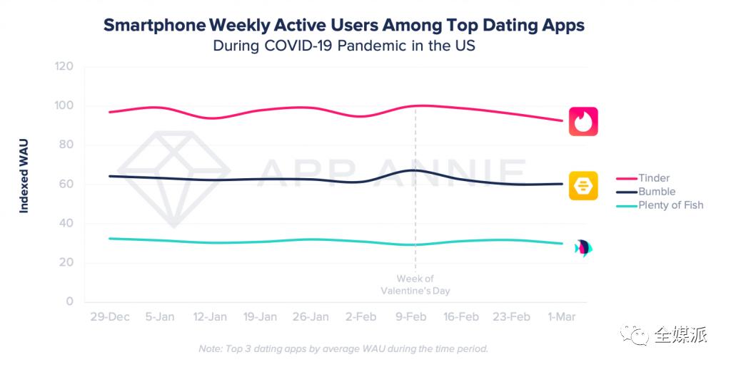 在情人节过后,美国头部约会软件的活跃用户有所减少,虽然这一趋势与往年没有太大差异(情人节期间约会软件往往到达活跃峰值),但今年的降低在某种程度上可以归因于疫情的影响。虽然在约会软件中,用户无需见面,只通过匹配和发送消息的方式保持活跃,但由于使用该应用往往会导致面对面的互动,这也造成了一定程度上的活跃度下滑。