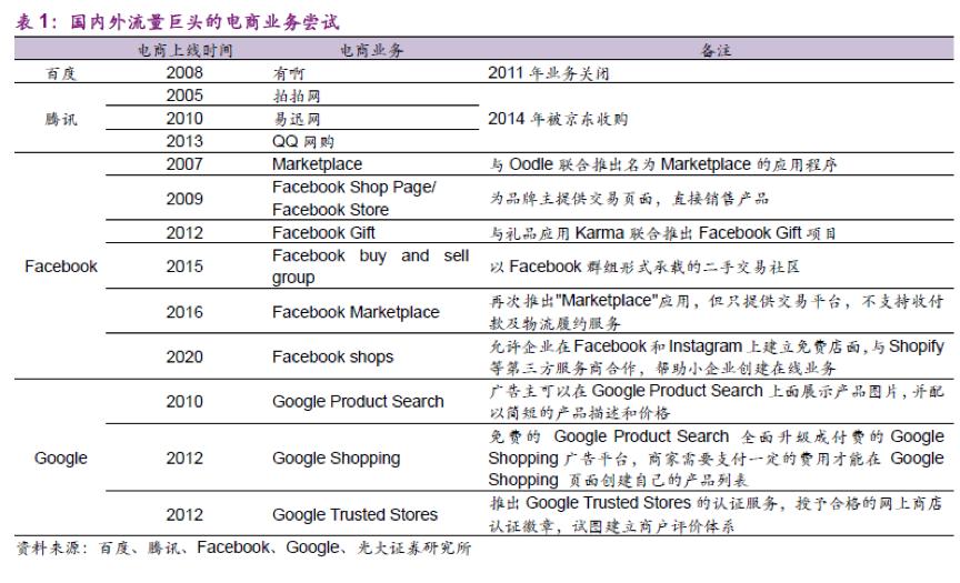 而从历史经验上看,无论是百度还是腾讯,流量平台自建电商以完成交易闭环无一成功。即便在美国市场,全球流量霸主的Facebook和Google在自建电商平台方面同样经历了一定的挫折。