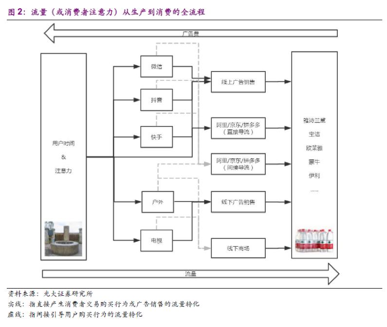 光大证券分析称,阿里、京东等电商平台在流量生产端从不具备任何优势,但却在流量的变现效率方面显著超越了其他社交及内容平台。整个互联网行业的用户时长及注意力像河流一样从微信、抖音等“水源地”通过直接或间接的方式流向阿里、京东等“水电站”,从而完成流量变现的全过程。