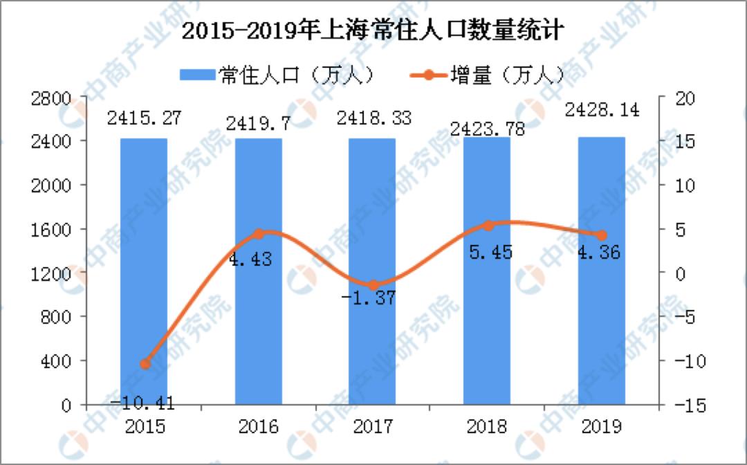人口方面,2019年上海常住人口总数为2428.14万人,较2018年仅仅增加4.36万人。