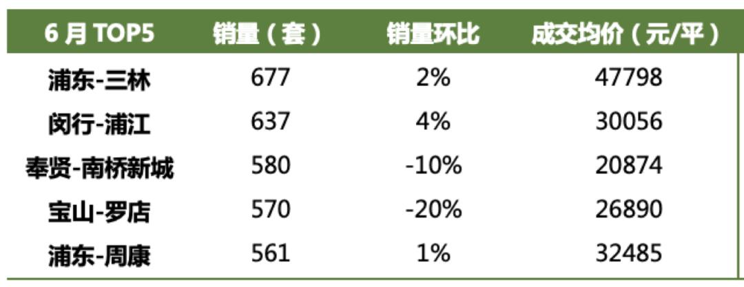 板块销量方面,TOP5分别为三林、浦江、南桥新城、罗店、周康。分环线来看,上海6月份外郊环间成交10280套,占比37%。内环以内成交3300套,占比12%。
