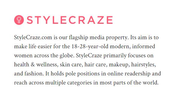 StyleCraze 是一个保健和美容网站,它的目标群体是 18-28 岁的女性,旨在使她们更舒适便利地生活。每个月该网站会在全球范围内,吸引超过 1500 万名访问者。平台的专家会提供专业的内容,解决用户日常在美容、皮肤护理、护发、化妆、发型、时尚和健康等方面的相关问题。