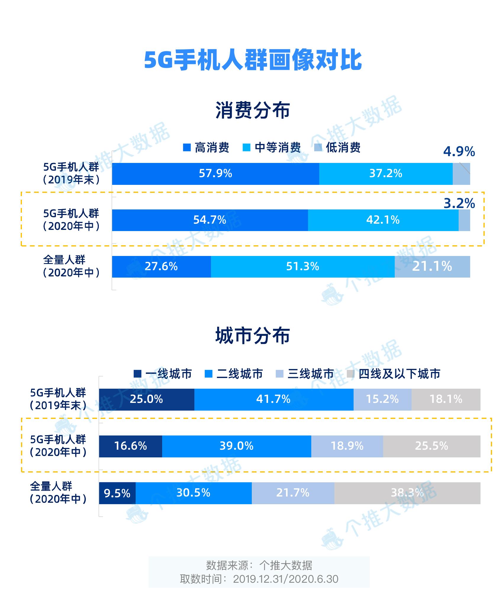 2020上半年5G手机快速抢占市场,截至2020年二季度,5G手机的市占率达4.3%,是一季度的2.5倍,其中华为Mate30 pro和华为Mate30两款机型最受欢迎。此外,从用户画像分析看出,5G手机正在向全年龄段、全市场普及。