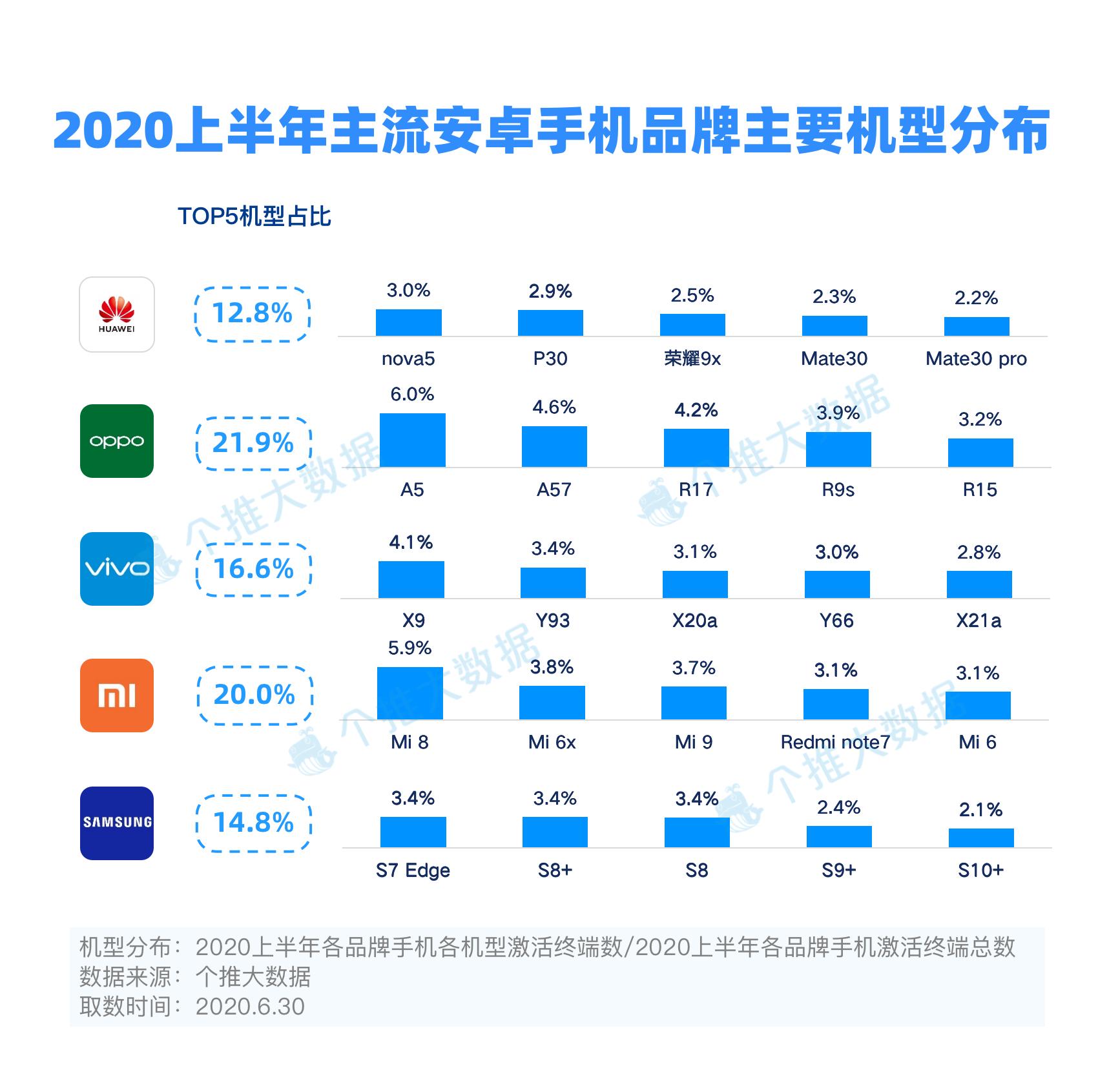 关注完5G手机市场,让我们再跟着数据回顾2020上半年整个安卓智能手机市场概况。