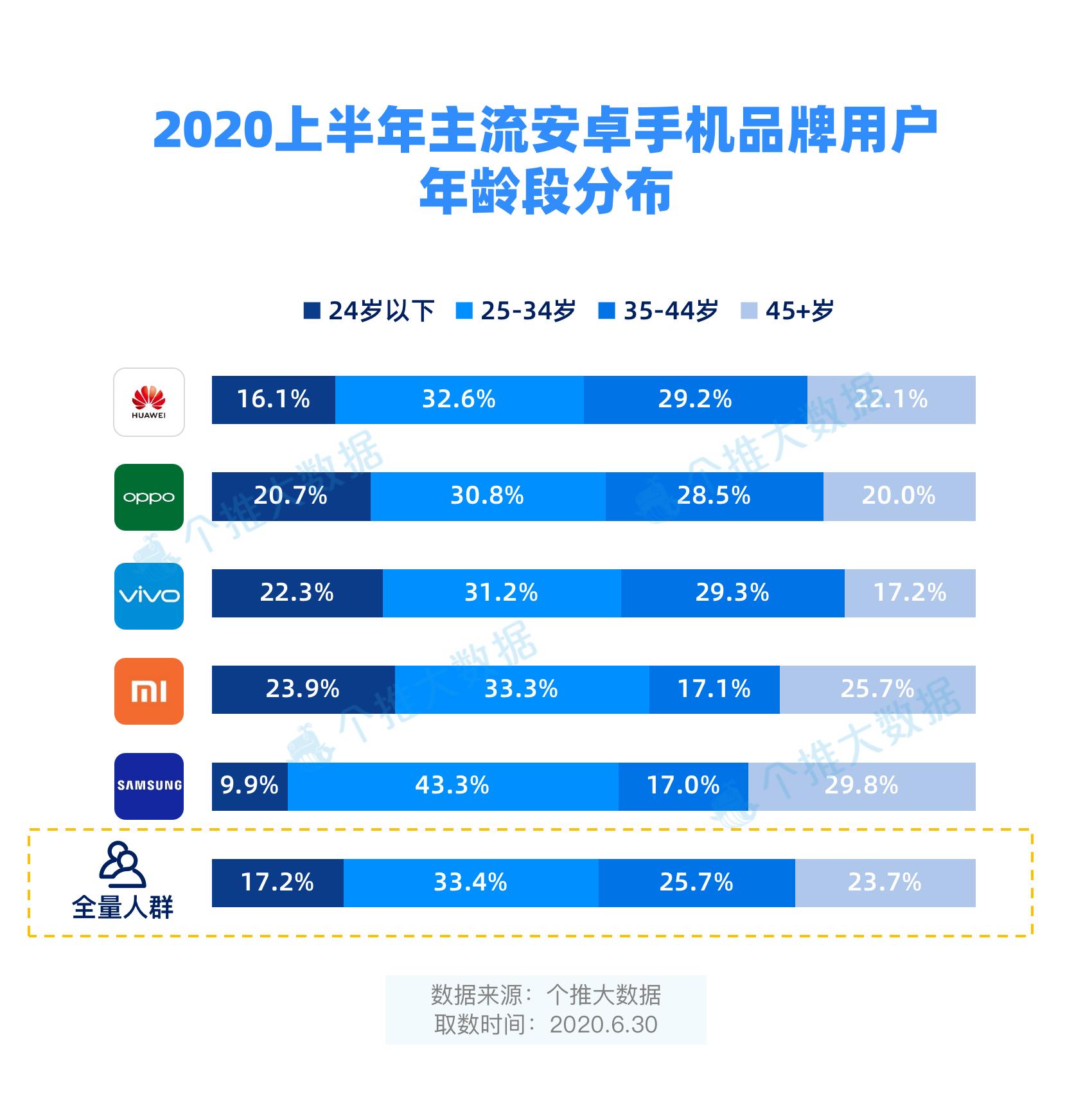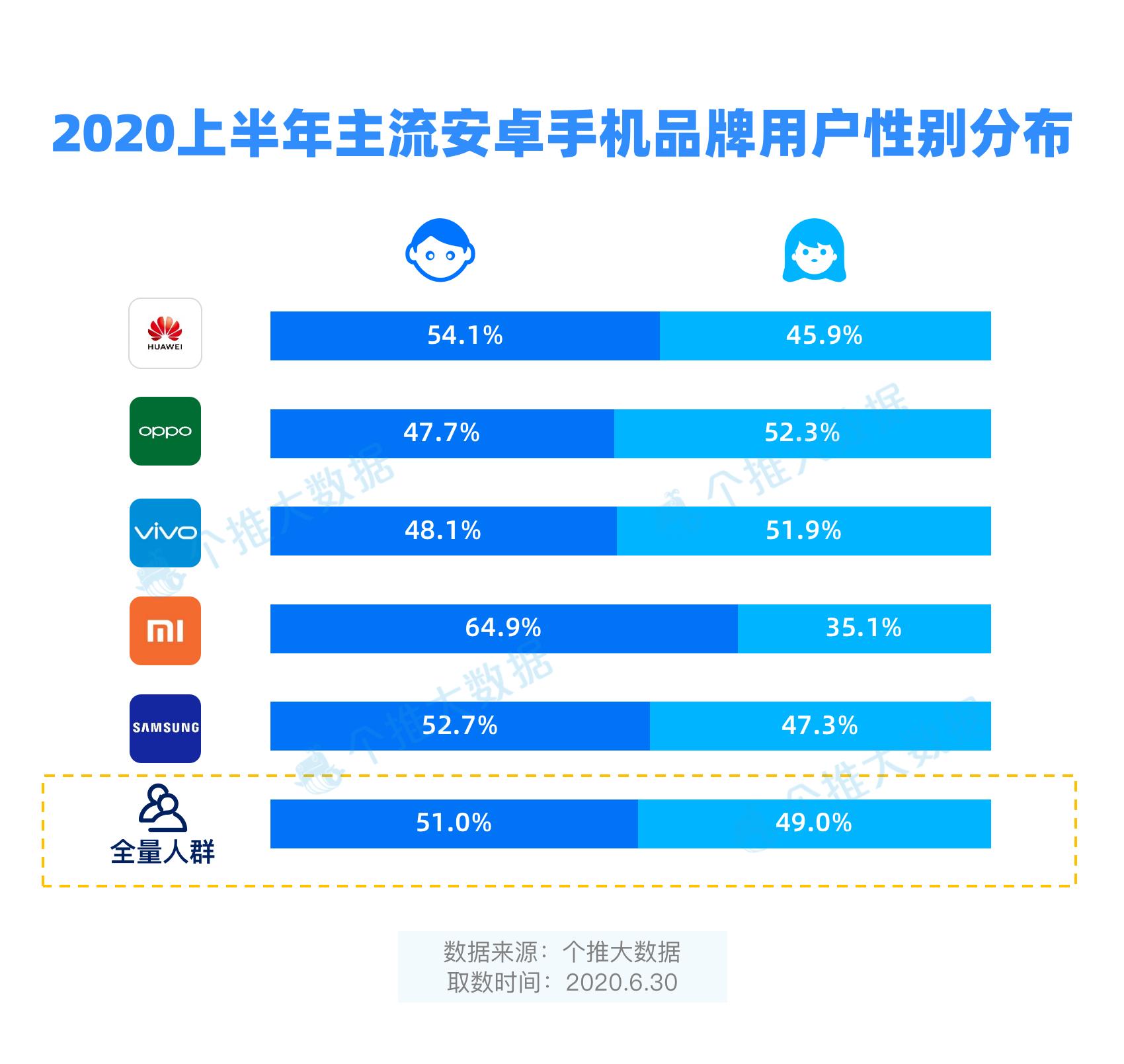 截至2020上半年,华为、三星用户中性别分布与全量人群性别分布较为接近。OPPO和vivo手机用户画像呈现出新面貌,OPPO手机的女性用户占比52.3%,vivo手机女性用户占比51.9%,均超过了全量人群女性占比。OV手机深懂女性用户,不仅在外观颜值和拍照功能上下足了功夫,还冠名多档综艺节目、请顶级流量明星助阵,难免让女性同胞们爱不释手。