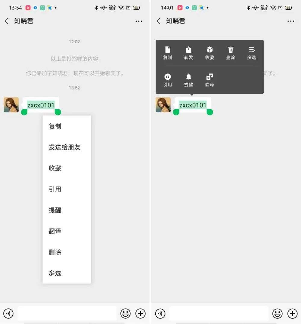 微信 7.0.17 for Android 内测版对这个问题给出了新回答。那就是在两分钟撤回时间内,直接不显示「删除」按钮,两分钟撤回时间后,仅显示「删除」按钮。两个选择不再同时存在,出错的概率很低了。