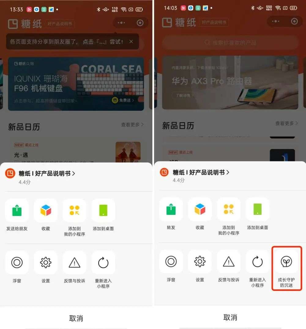 而在微信 7.0.17 for Android 内测版中,我们发现小程序也全面接入了防沉迷系统。不管是工具类小程序还是娱乐类小程序,不管是电商小程序还是资讯小程序,点击「...」即可看到新增的「防沉迷」按钮,点击后则跳转「腾讯家庭守护」小程序。
