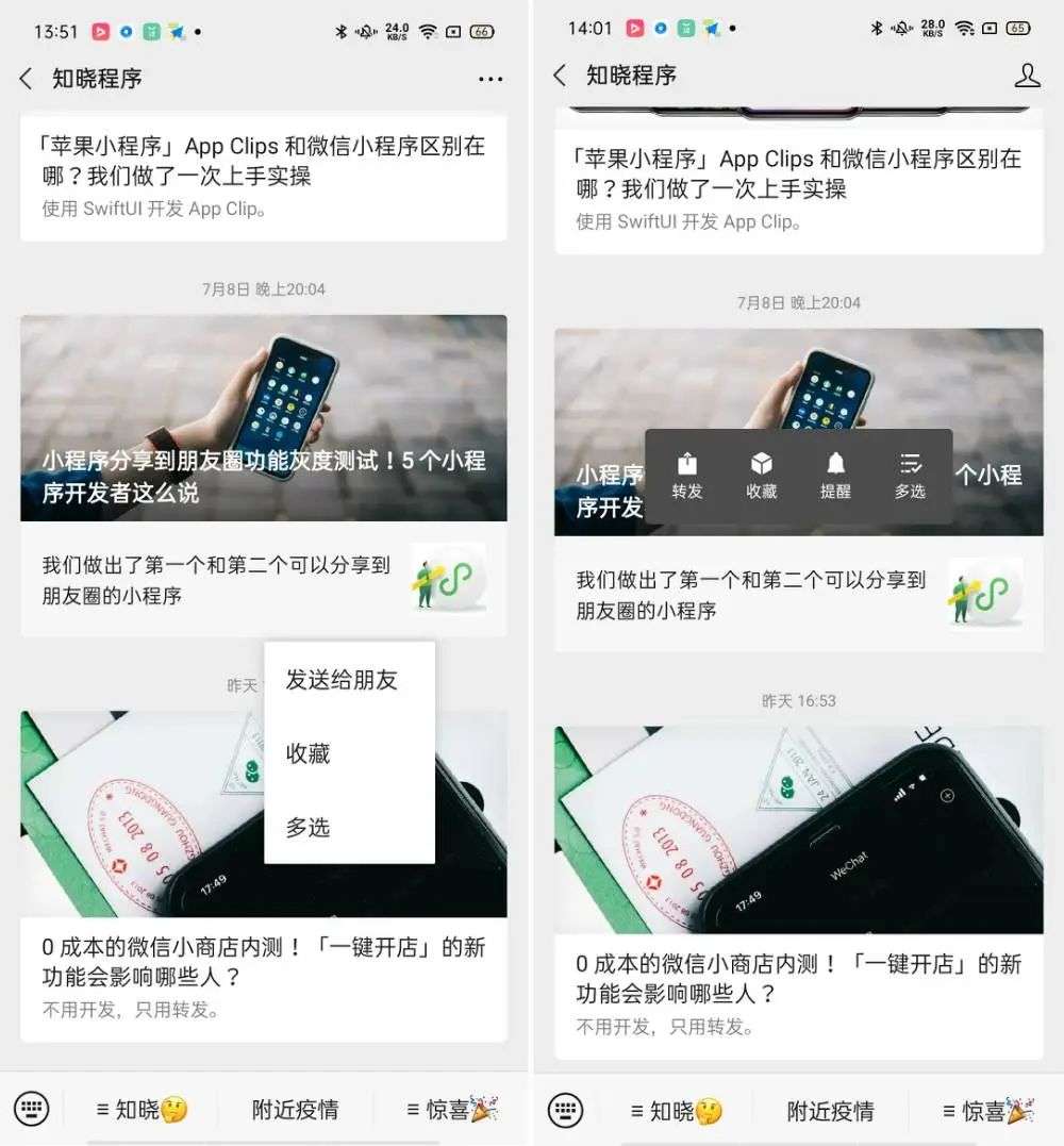 左为 7.0.16 for Android 正式版,右为微信 7.0.17 for Android 内测版