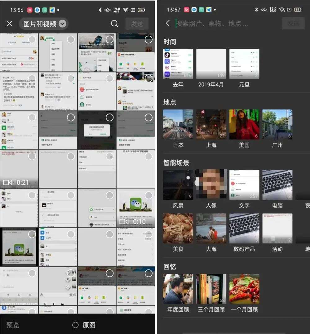 微信 for Android 用户能在发送图片界面的右上角看到一个新增的搜索按钮,点开就能看到按照时间、地点、智能场景、回忆划分的不同类别图片。