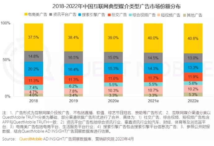 微盟的精准营销业务其实就是广告与资源的买与卖,主要收入就是流量平台的返点佣金。微盟主要从事的广告推广是在微信体系内,此外还有QQ、腾讯新闻、百度、知乎等流量平台的精准营销服务。不过这些广告的媒介大多是资讯类、搜索类、社交类,根据Questmobile数据显示,电商类广告在所有互联网媒介广告类型中,市场份额分布最高,且持续上升,而微盟主要针对的资讯类、搜索类广告市场份额持续下降。