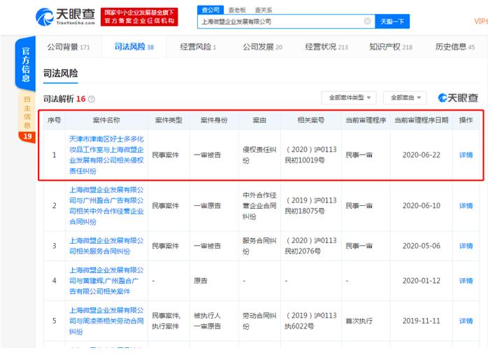 不过根据第三方平台天眼查显示,6月22日天津好士多多化妆品起诉上海微盟企业发展有限公司侵权案件开审,也不排除这一方面的影响。