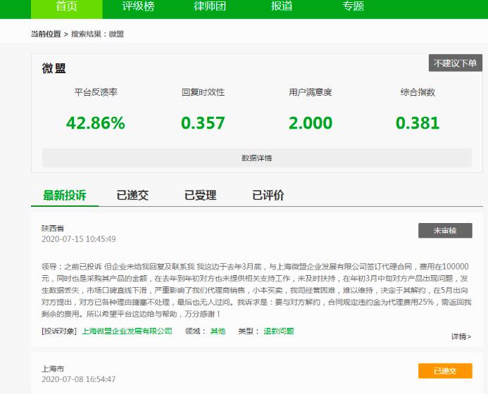 但微盟并没有注意这一点,在国内电商投诉平台电诉宝上,有“删库事件”受影响的小商家维权,有退款、售后、货不对板问题,用户满意度为2,评级为不建议下单。