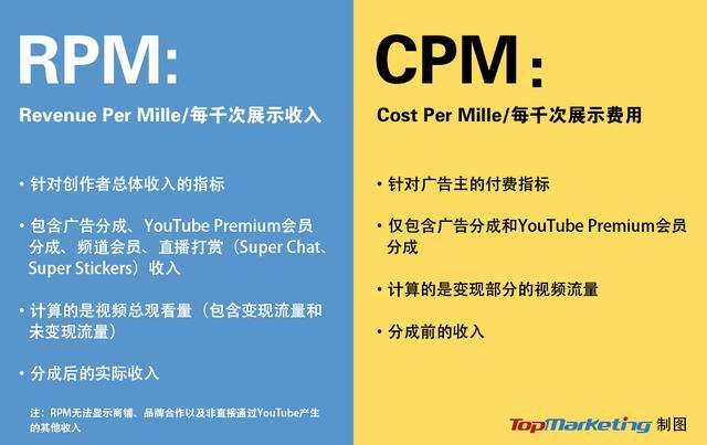 它与CPM有很大不同。CPM以广告主为核心,浏览量计算仅包括可变现的部分,并且显示的是YouTube分成前的数字。