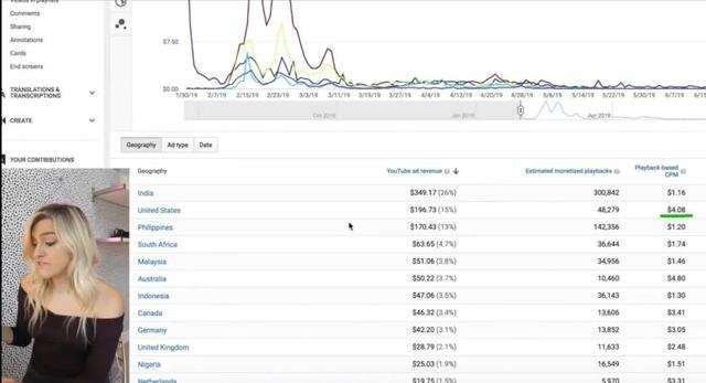 另一生活类YouTuber也曾晒出自己某个视频的观看人群组成,其中印度、菲律宾、马来西亚等国家的用户CPM在1.1-1.5美元左右,而美国、澳大利亚用户CPM则能达到4-5美元。