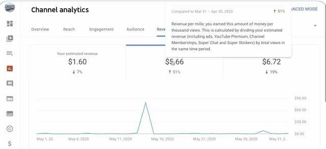 于是,YouTube最近新推出了“RPM”(Revenue Per Mille)的指标,即“每千次展示收入”,用来衡量创作者的多项收入指标。