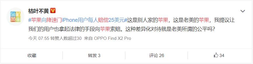 7月14日,微博话题#苹果向降速门iPhone用户每人赔偿25美元#冲上热搜,面对苹果的妥协,广大中国用户还没来得及热烈欢呼,就发现被苹果区别对待了!