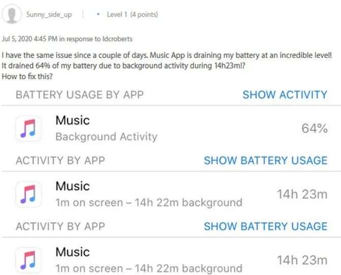 国外科技网站MacRumors最先注意到这一异常,“使用Apple Music时都会消耗大量电量。即使没有打开Apple Music,Apple Music也会通过后台活动持续消耗电量。”