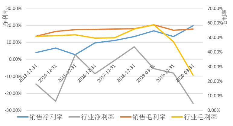 同庆楼销售利率高于同业。2013年以来同庆楼销售毛利率一直保持在50%以上,2020年第一季度销售毛利率为55.84%,行业平均仅为24.12%,但毛利率增长遭遇天花板。销售净利率呈增长态势,远高于行业平均。