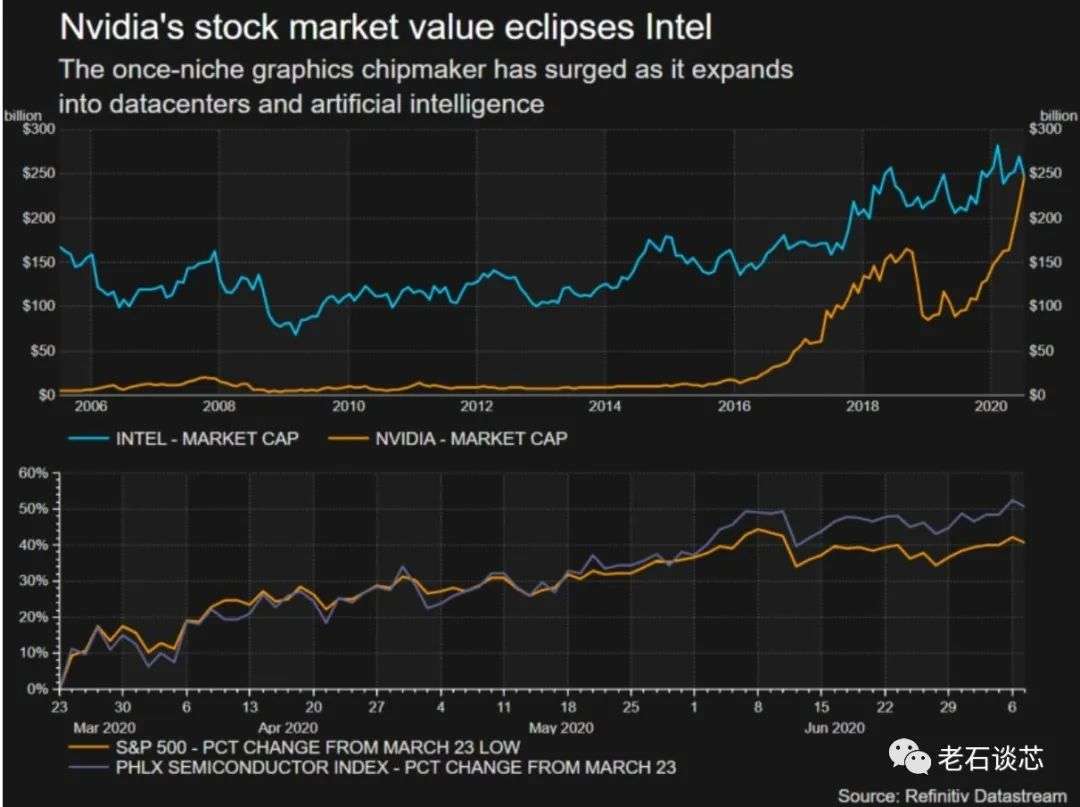 事实上,这样的趋势从2020年开年就开始了。在2020年,英伟达的股价上涨了68%,而英特尔则下降了3%。就在这一正一负、一涨一跌之间,美国第一大芯片公司就这样被拱手让出。