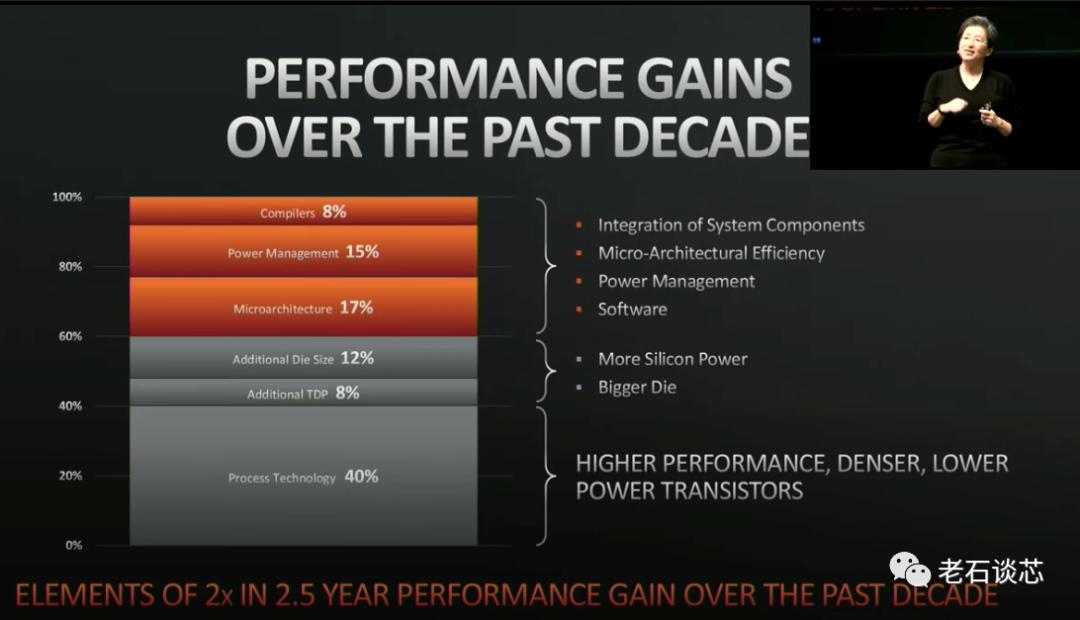 在2019年的HotChips大会上,AMD的CEO苏姿丰博士发表了主旨演讲。她在演讲里提到了一个非常有趣但深刻的内容,在过去的10年间,芯片性能的提升有40%直接来自于半导体工艺的更新换代,20%也与工艺直接相关,比如更大的晶圆面积等。与之相比,只有17%来自芯片的架构升级。由此可见半导体工艺对整个芯片行业的重要性。