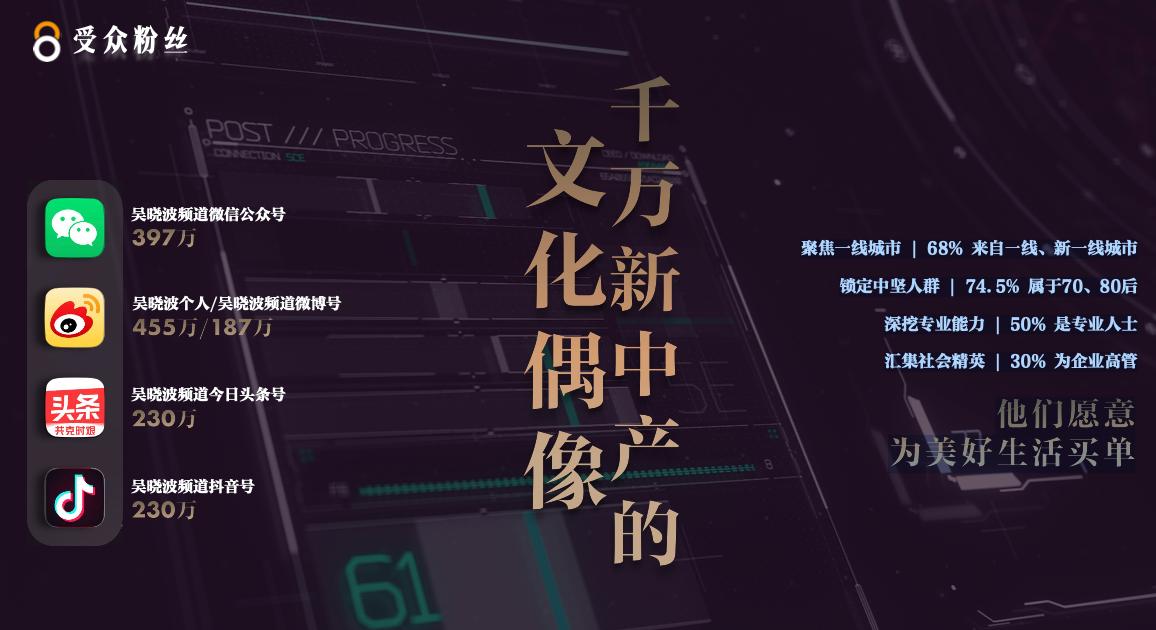 吴晓波直播招商材料介绍称其在微信、微博、头条与抖音等平台均有数百万粉丝,其中68%来自一线、新一线城市,74.5% 属于70、80后,50% 是专业人士、社会精英 ,30%为企业高管,自己是“千万新中产的文化偶像”,“他们愿意为美好生活买单”。
