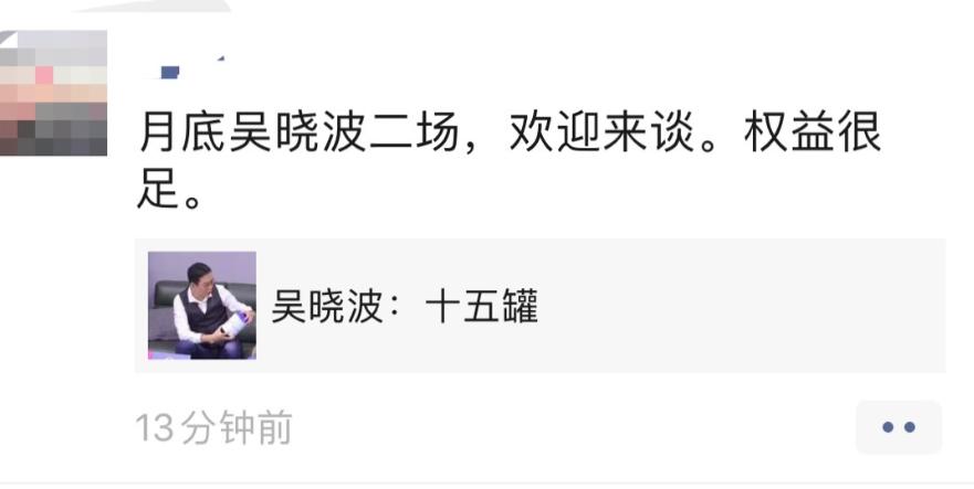 这篇文章发布后,在外界尚在猜测吴晓波直播会不会出道即终止时,今天我的朋友圈出现了吴晓波月底第二次直播的招商广告,招商人士表示“权益很足”。