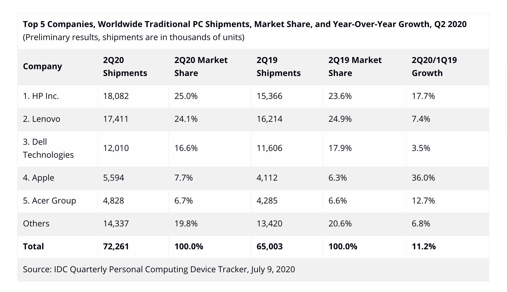 IDC最新数据显示,2020年第二季度,全球PC市场出货量达到7226.1万台,同比增长11.2%,创下近年来最大涨幅。