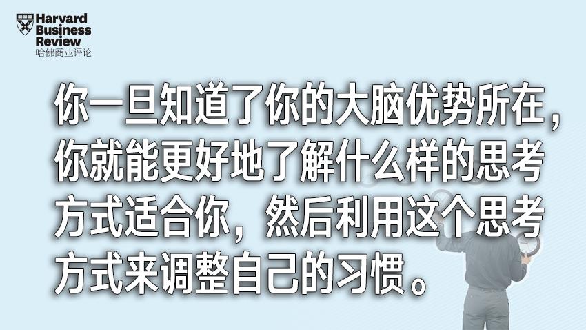 如果你觉得做规划是一件极其困难的事,你就很可能不是天生左后脑占优势。如果想知道你大脑的哪个部位占优势,你可以完成《Thriving in Mind》一书中的自我评估问卷,或者参与更正式的“本希格思维方式评估”(Benziger Thinking Styles Assessment)。你一旦知道了你的大脑优势所在,你就能更好地了解什么样的思考方式适合你,然后利用这个思考方式来调整自己的习惯。比如,我完成了《Thriving in Mind》的自我评估问卷,从而更清楚自己为什么可以很自然地从事某些类型的工作,又为什么会避开其它类型的工作。