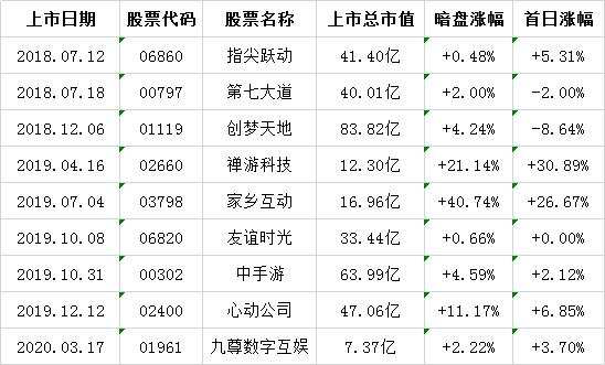 并且纵观自2018年以来在港首发上市的内地游戏公司IPO行情数据,两年来的9只内地游戏新股,暗盘全线收涨,首日则是6涨1平2跌。总体来看,市场看涨仍为主要基调。