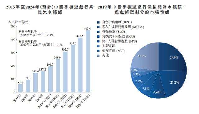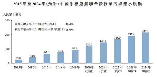 中国的手机游戏行业自2016年以来一直在主导中国的线上游戏市场。手机网络游戏的总流水由2015年的562亿元增长到至2019年的1947亿元,复合年增长率为36.4%。随着智能手机使用量不断增加以及移动互联网技术的突破,手游市场预计将成为利润最高已经增长最快的分部,预计在2024年实现占整个网络游戏行业80.3%。