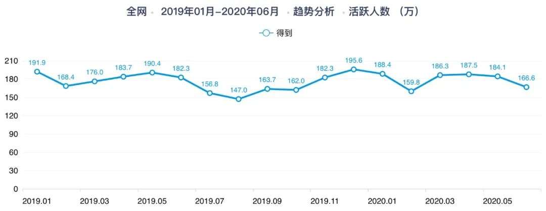 从2016年5月得到App上线到2018年,得到App的月活基本在200万—300万之间浮动。进入2019年后,得到App月活下降至200万以下,最低还跌过150万月活以下。最近半年来,得到App月活基本上维持在180多万,最低为2月份159.8万。