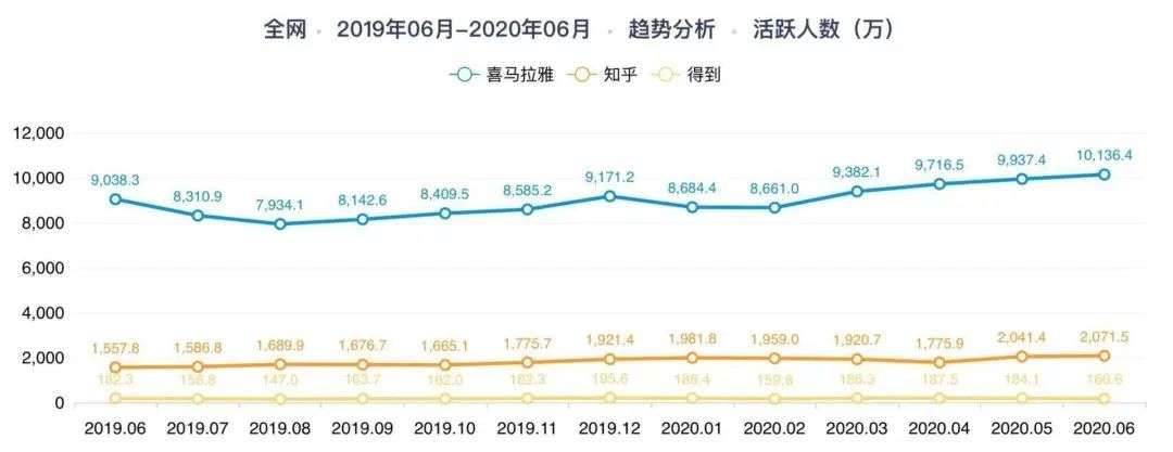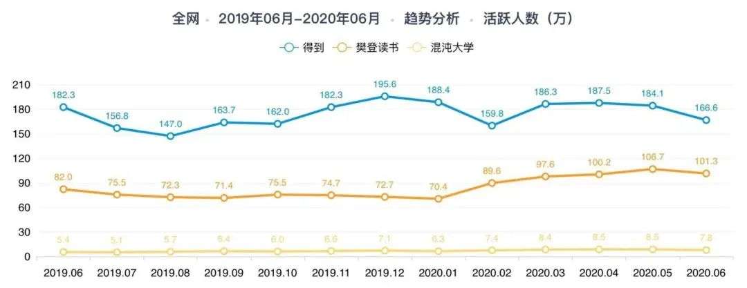 而在知识付费领域,常被拿来与得到做比较的同类产品主要有樊登读书和混沌大学。与樊登读书和混沌大学或快或慢的增长相比,得到的月活数起伏较为激烈。