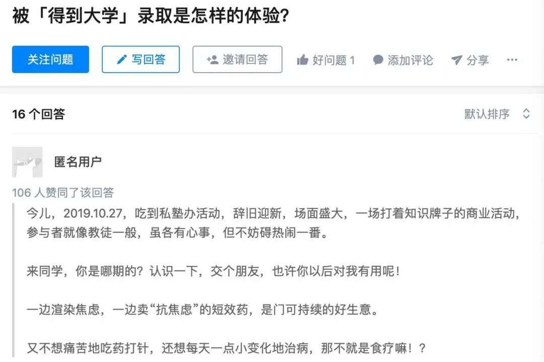 也有学员持不同意见。在学员们都在得到App站内为得到大学站台、在每期招生简章下方走心留言的同时,有人仍将得到大学视为“贩卖焦虑的营销套路”。